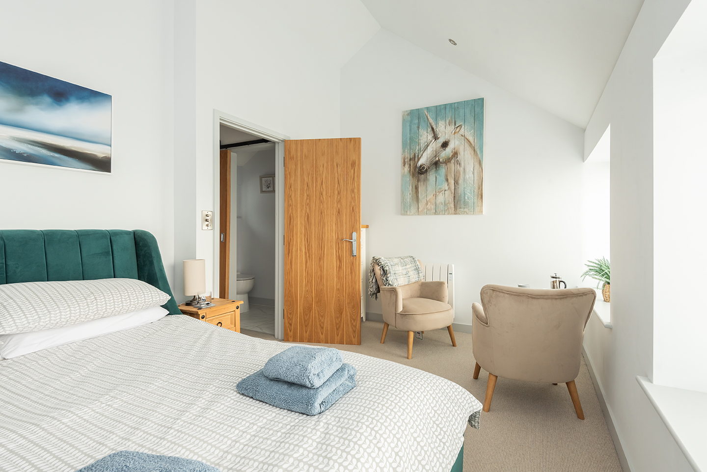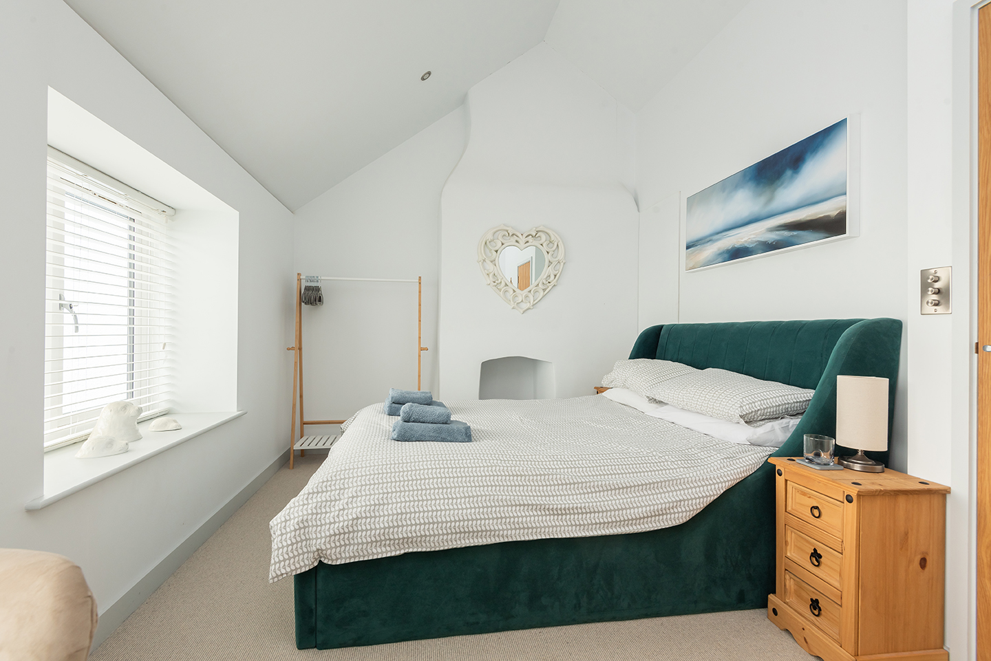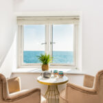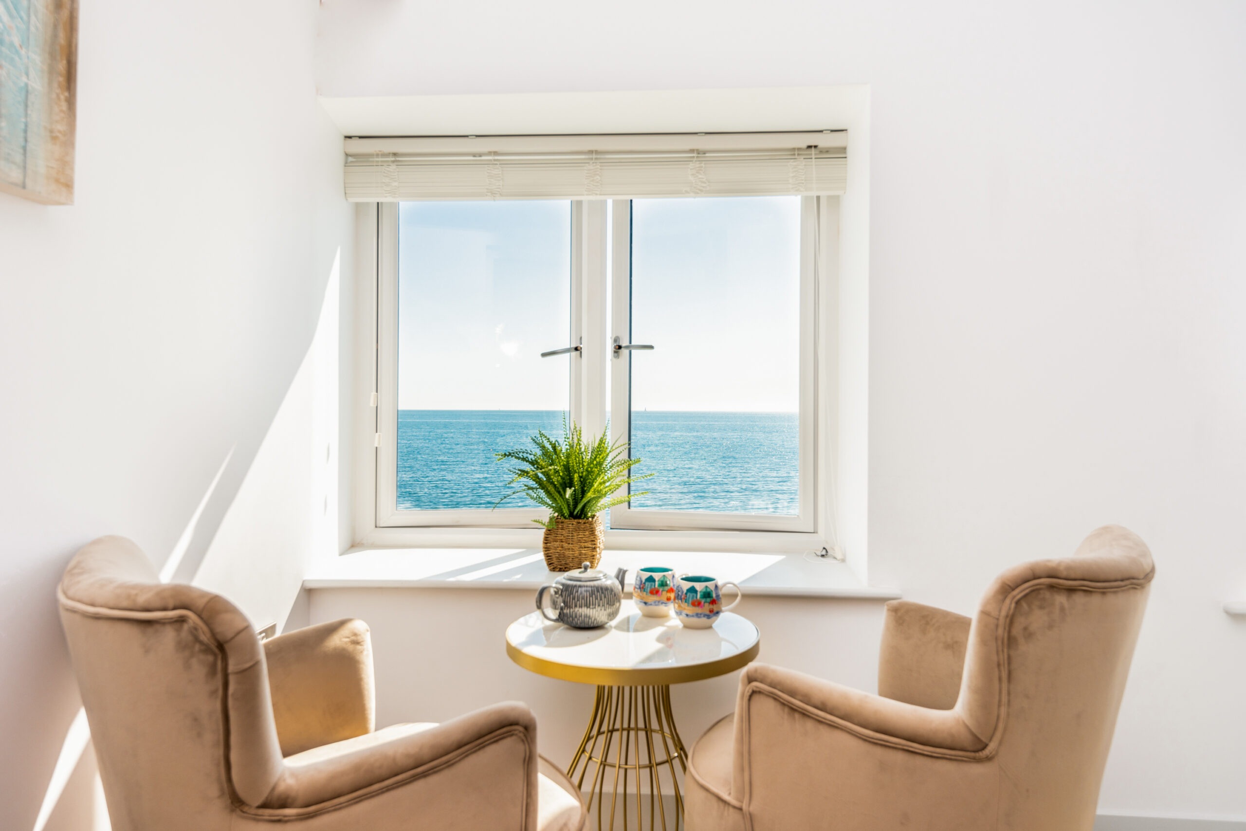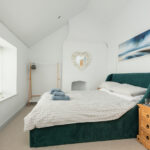 Upstairs, the principal bedroom is truly special. With its vaulted ceiling and elevated position, it captures uninterrupted views across the water. Whether enjoying a quiet morning coffee from the seating area or simply listening to the waves from bed, it offers a rare sense of calm and perspective.
