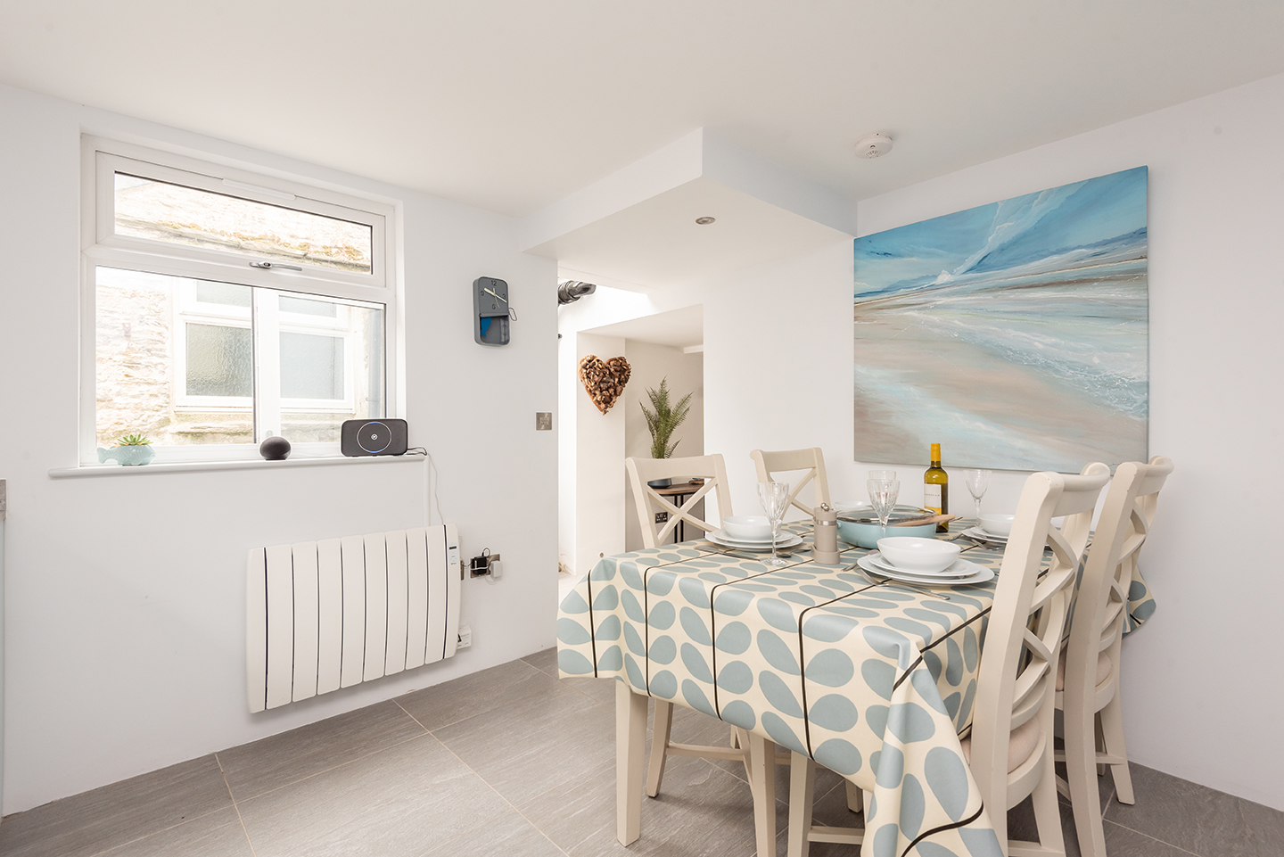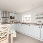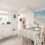 There is a natural flow through to the kitchen/dining space, which is well-appointed and sociable, ideal for long, easy suppers after days by the sea.