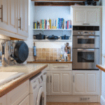 The ground floor features a welcoming hallway, leading into a generous dining room or secondary reception space with parquet flooring running throughout. This striking room showcases whitewashed exposed stone walls, a beautiful inglenook fireplace with built-in cupboards and shelves either side, original Georgian sized windows with pine shutters and painted tongue-and- groove panelling - creating a timeless, classic feel. The adjacent kitchen continues the whitewashed stonework and is styled as a bright galley kitchen with exposed beams, built-in cupboards, and charming alcove details.