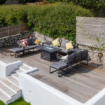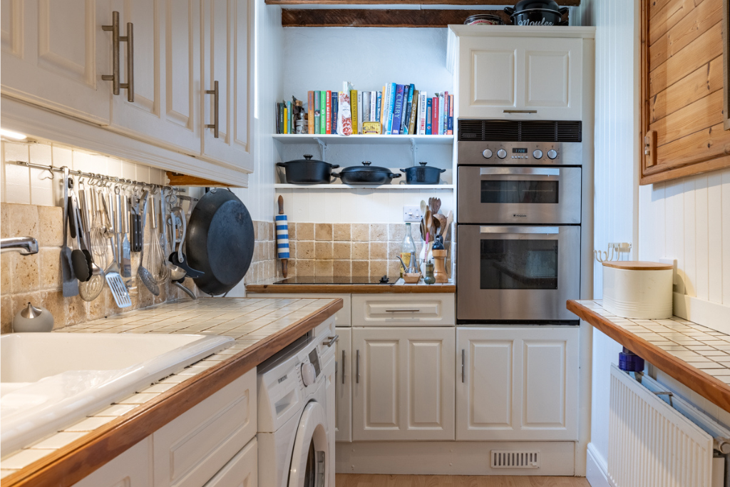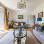 The rear elevation of the house is equally charming, with its stone construction and slate-hung upper façade, creating a picturesque backdrop to the garden. There’s also a limestone paved area adjoining the house, ideal for a breakfast table or evening drinks, and practical storage areas for paddleboards, garden tools and other outdoor essentials.