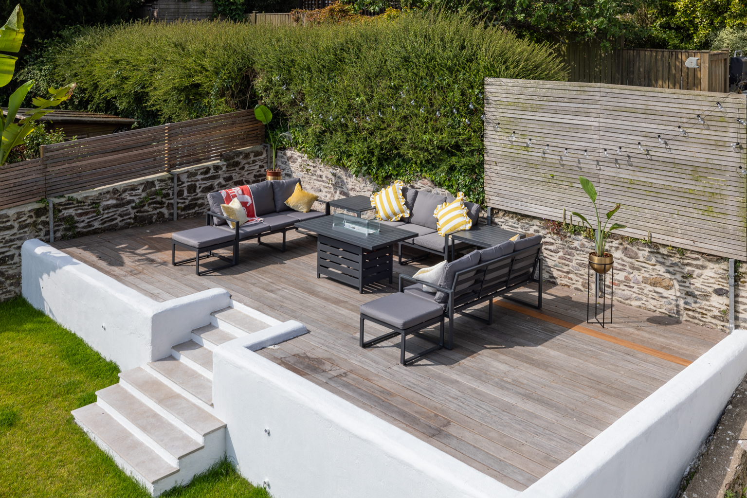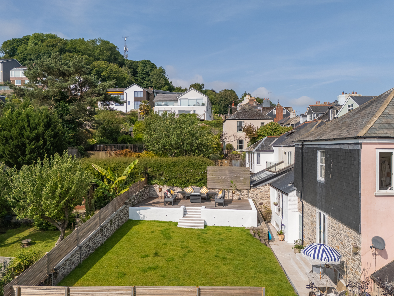 The garden is fully enclosed with traditional stone walling and topped with modern cedar strip fencing, blending classic character with a clean, contemporary edge. The outlook is simply breathtaking: south-facing and wonderfully private, the garden enjoys uninterrupted views across the River Dart to Kingswear and beyond - a true standout feature.
