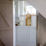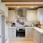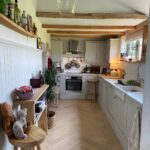 This room flows into the kitchen which also has an entrance convenient for more practical entry. Very stylishly finished with parquet flooring and tongue and groove wood panelling, setting the kitchen units off perfectly. All painted in a pretty dove grey. The standout feature are the four windows all facing out onto green open fields, flooding the room with light.
