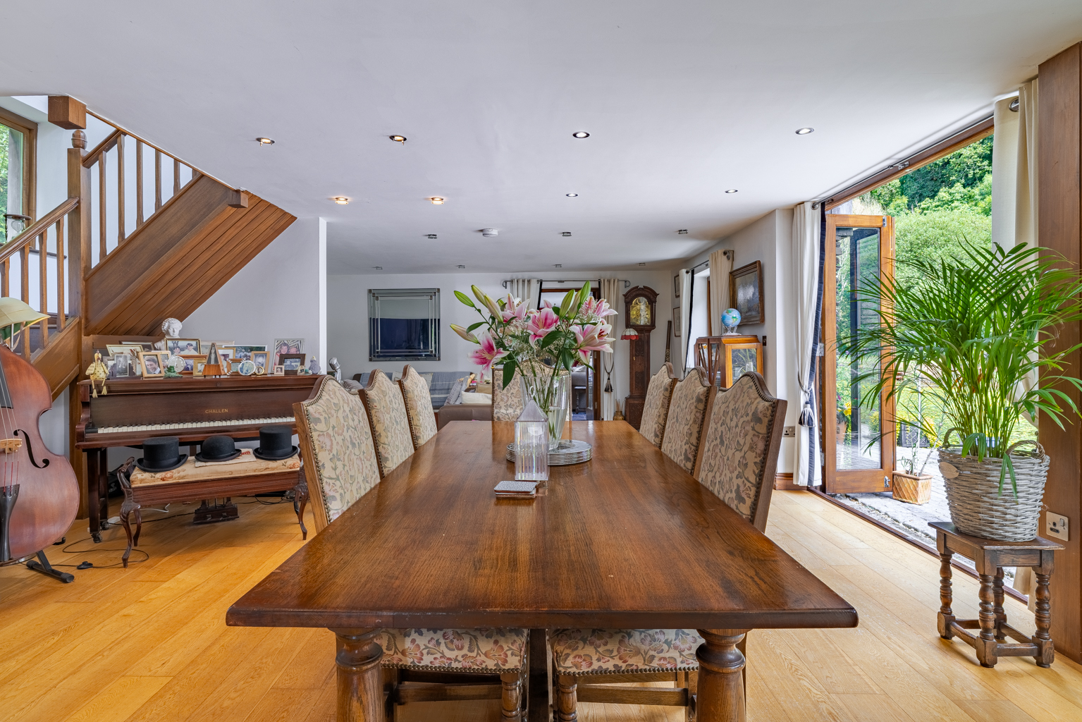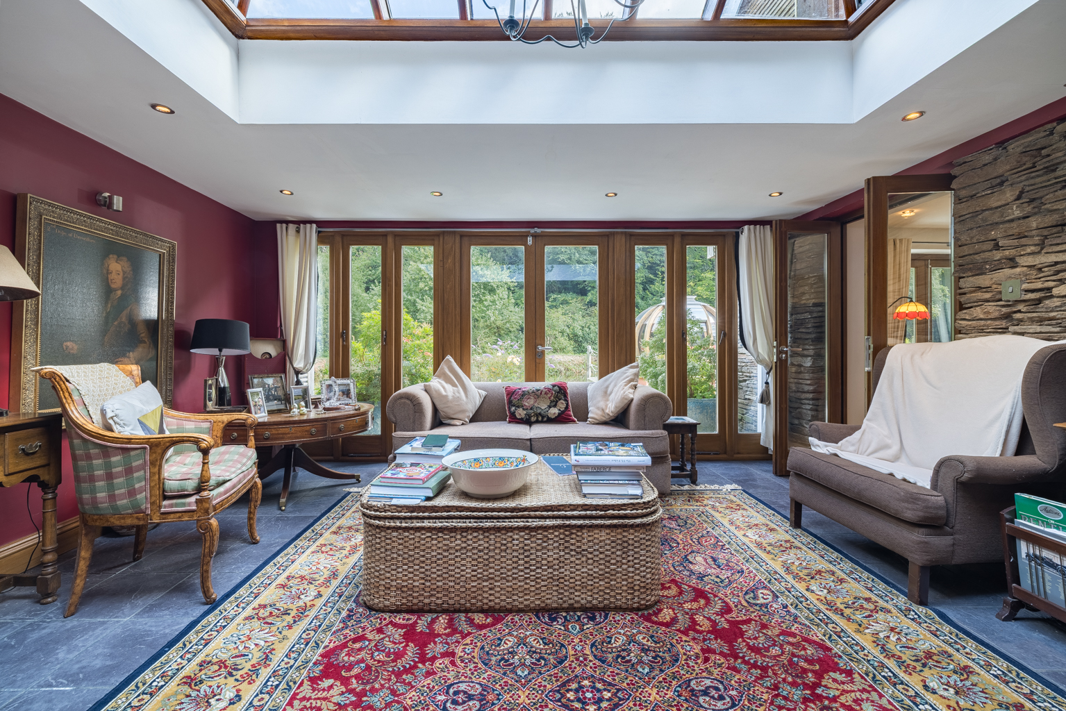 Separate generously proportioned, secondary accommodation spans two floors, featuring an open-plan kitchen, dining, and sitting area with sliding doors that open to a veranda with a hot tub. This space includes a double bedroom with a dressing room and an en-suite shower room.